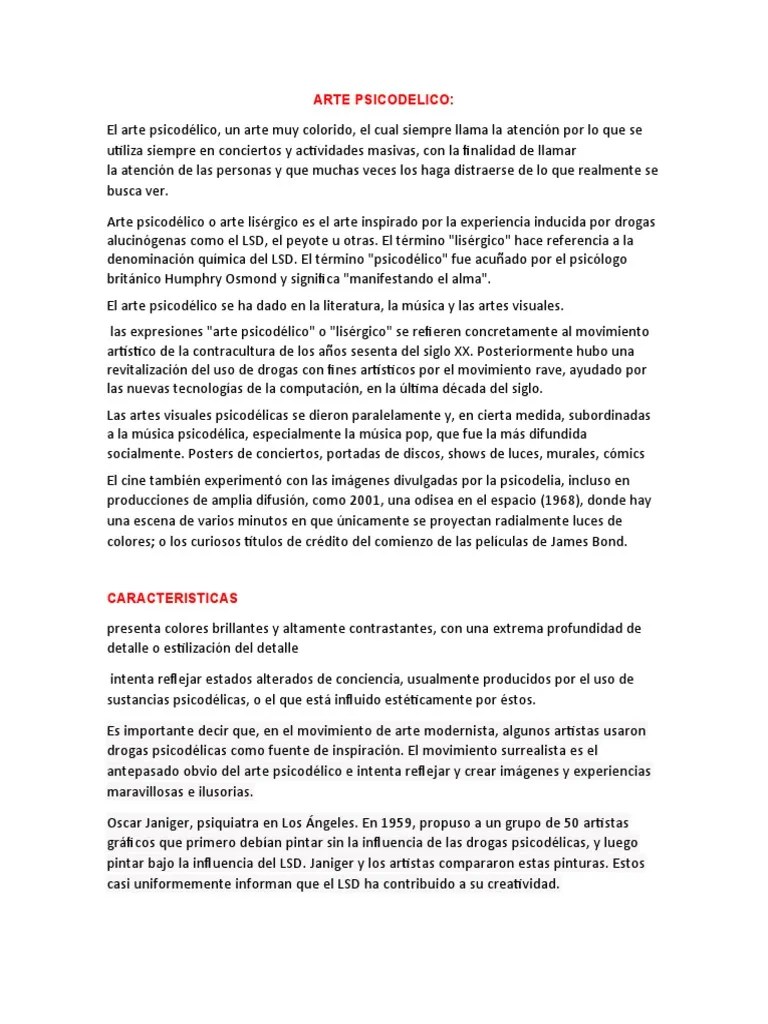 El arte psicodélico, también nombrado como arte lisérgico, es una modalidad de arte que trata principalmente de las experiencias que tiene una persona con las drogas alucinógenas como por ejemplo el lsd. El arte psicodélico, también nombrado como arte lisérgico, es una modalidad de arte que trata principalmente de las experiencias que tiene una persona con las drogas alucinógenas como por ejemplo el lsd.. Mistura de diferentes estilos (rock psicodélico, cultura popular, música erudita, cultura brega, etc) inserção de gêneros musicais estrangeiros no país;